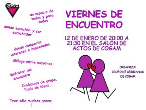 El viernes 12 de enero tenemos otro Viernes de Encuentro, será en el salón de COGAM donde nos conoceremos, charlaremos y pondremos en común lo que queremos y necesitamos.