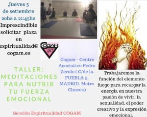 El objetivo del taller es guiarte en una técnica de meditación que aumente tu capacidad energética para afrontar los retos del día a día.Trabajaremos la función del elemento fuego para recargar la energía en nuestra pasión de vivir, la sexualidad, el poder creativo y la expresión emocional.
