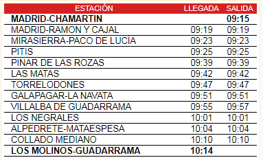 El tren sale a las 9:15. Cuidado de no perder el tren. El tren pasa por otras estaciones como ves en el cuadro. Para quien se suba en otras estaciones, iremos en el último vagón. Llegaremos a Los Molinos a las 10:15, donde nos bajaremos.